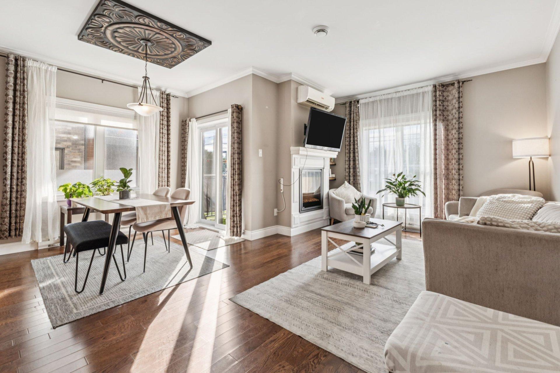 Superbe condo de coin de près de 900 pi², situé au rez-de-chaussée, incluant 2 stationnements. Cette unité offre une insonorisation supérieure avec son plancher de béton. L'espace de vie à aire ouverte est submergé de lumière naturelle. Vous y trouverez des plafonds lisses de 9 pieds avec moulures, des planchers en bois franc et céramique, ainsi qu'un chaleureux foyer électrique au salon. La grande cuisine comprends amplement d'espace de rangement. Deux grands balcons, un climatiseur mural, un espace de rangement extérieur. À proximité de tous les services.