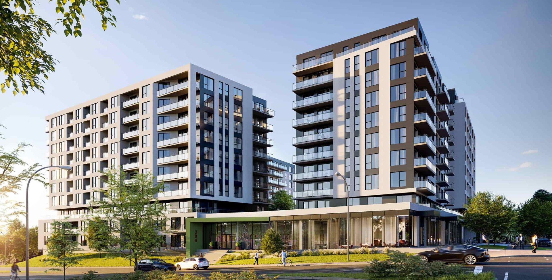 | Espaces commerciaux au rez-de-chaussée disponibles à la location dans le nouvel édifice "Bloome", qui compte 380 unités résidentielles. |